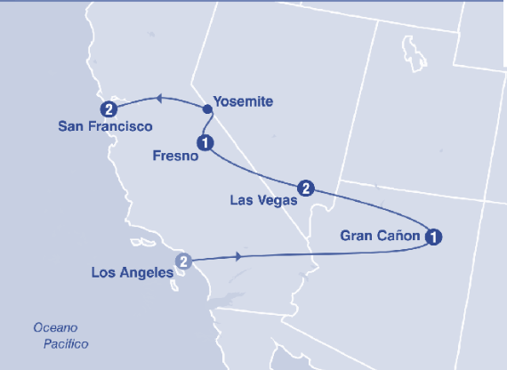 Los Ángeles es una ciudad vibrante conocida por su industria del cine, playas soleadas y atracciones. El Gran Cañón, una maravilla natural, impresiona con su inmensidad y formaciones rocosas únicas. Las Vegas es famosa por sus casinos, vida nocturna y espectáculos deslumbrantes. Oakhurst y Mammoth Lakes, cerca de Yosemite, ofrecen paisajes montañosos ideales para actividades al aire libre como el senderismo y el esquí. Yosemite, con sus majestuosos acantilados y cascadas, es un paraíso para los amantes de la naturaleza. San Francisco, famosa por el puente Golden Gate y su vibrante escena cultural, es una ciudad llena de historia y encanto.